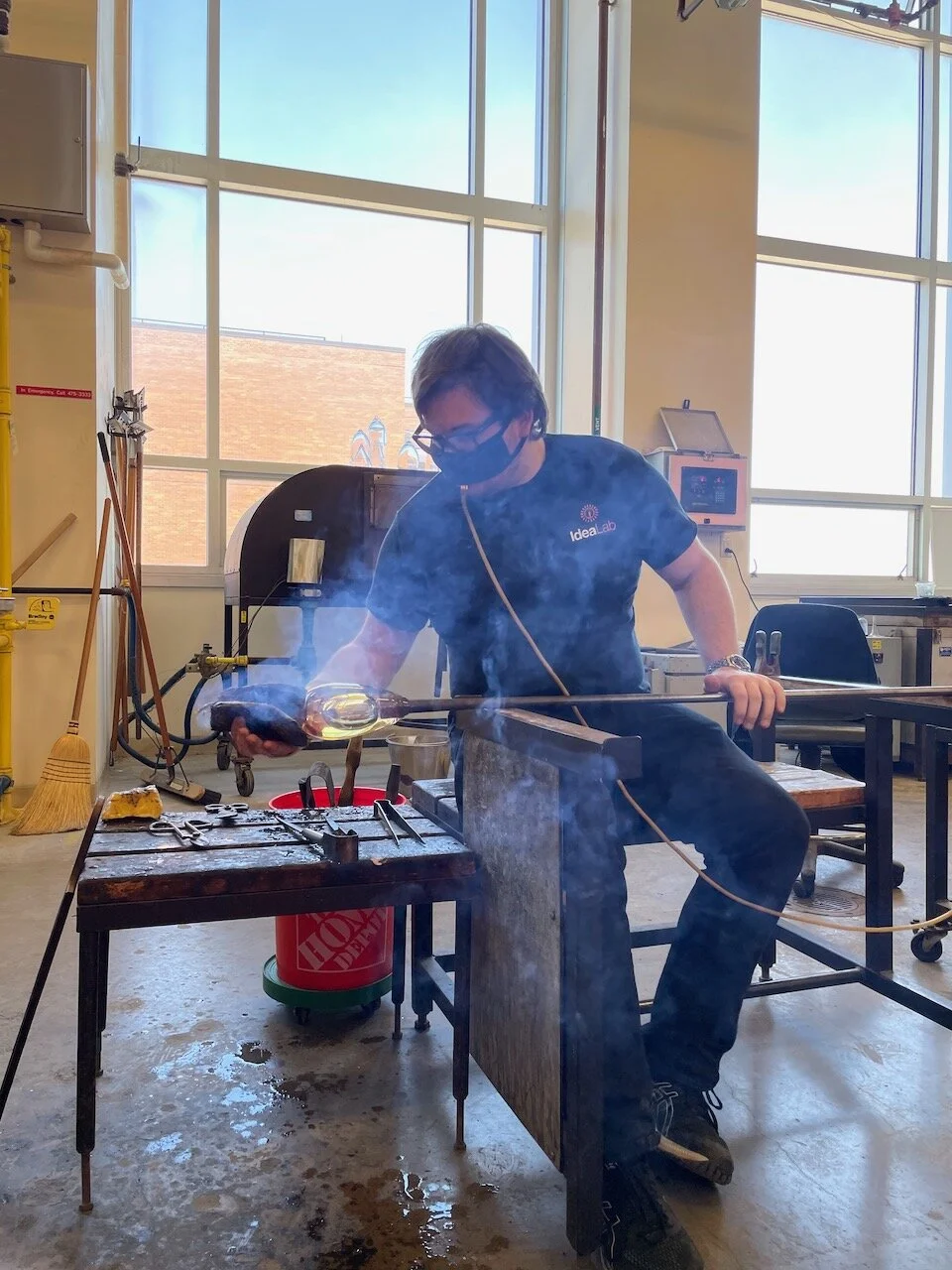 Working at the bench, forming hot glass into the vessel.